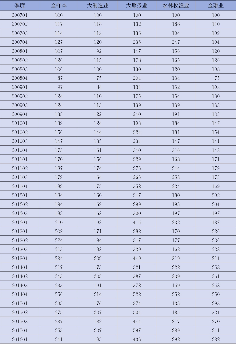由表2-5和图2-6可知,自2009年第1季度以来,各行业价值创造额指数呈逐渐上升趋势。