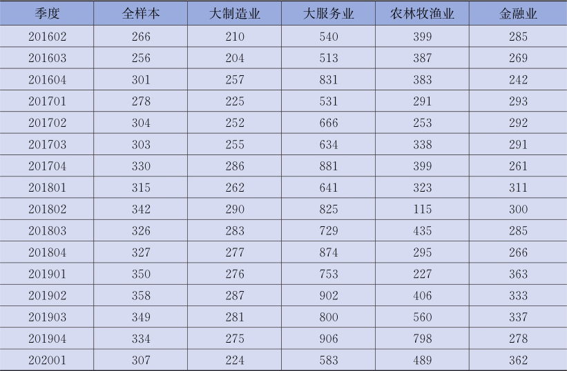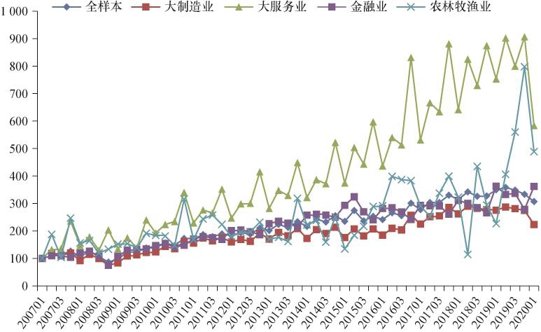 全样本与大制造业价值创造额指数较为一致,均自2008年金融危机以来稳中有升,并于2017年第4季度达到一个小高峰, 2018年小幅下降, 2019年以来呈先上升后下降的趋势。