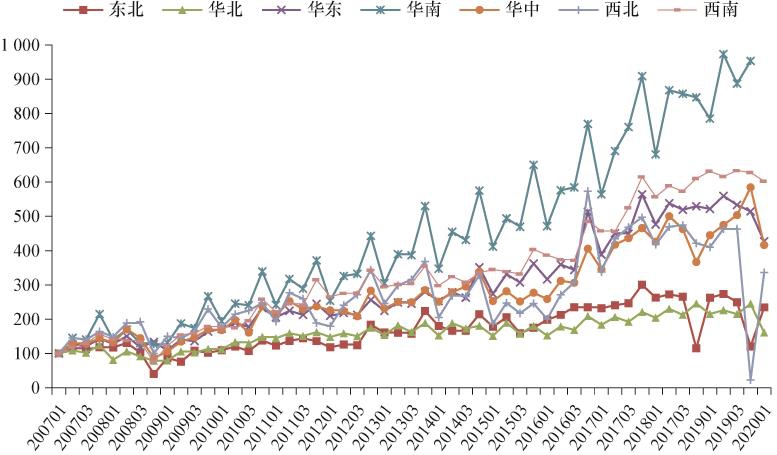 图2-8揭示了各地区上市公司价值创造额指数的变动情况。自2008年金融危机以来,各地区价值创造额指数总体呈波动上升趋势。其中,华南地区的总体增长幅度最大,并且从2016年开始增长幅度进一步扩大,在2019年第2季度达到最高值973点。西南地区在2016年以前保持着缓慢增长的态势, 2016年第3季度后快速攀升, 2017年第4季度高达615点,接近2016年第3季度的两倍, 2018年以来增速稍有放缓。华东和华中地区一直呈中速缓慢发展态势,且增长幅度极其相似, 2016年后都有一个较快的增长,然而2018—2019年,华东地区比较平稳,华中地区却表现出较大幅度的波动, 2020年第1季度两个地区均有所下滑。东北和华北地区近年来增长幅度则相对平缓,十年来仍然在300点以下徘徊,因此在推动各地区不断发展的同时,应关注华北和东北地区新的增长点。随着西部大开发战略的不断推进,西北地区的价值创造额指数呈现大幅上升趋势,但也有较大的波动,尤其是2019年第4季度出现断崖式下跌,这主要是由于西北地区样本数量较少,价值创造额指数容易受单个公司价值创造额波动的影响。统计显示, 2019年第4季度西北地区上市公司样本共计165家,其中,有29家公司第4季度的价值创造额出现骤降,价值创造额为负值。例如, ST刚泰(600687)的价值创造额从2019年第3季度的-0.07亿元下降至第4季度的-29.30亿元; ST盐湖(000792)的价值创造额从2019年第3季度的-12. 94亿元下降为第4季度的-453. 04亿元。因此,部分公司业绩爆雷是造成西北地区2019年第4季度价值创造额指数骤降的主要原因。