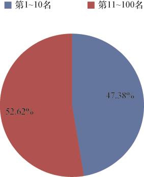 进一步对比前100名上市公司价值创造额的分布情况,由表2-8和图2-11可以发现,前100名上市公司价值创造额总量为79 893. 08亿元,其中前10名上市公司实现价值创造额37 851. 48亿元,占前100名上市公司价值创造额总量的比例高达47. 38%,占比接近一半,而第11~100名的上市公司实现价值创造额42 041. 60亿元,占前100名上市公司价值创造额的52. 62%,这再次表明我国经济龙头企业为社会整体创造了巨大的价值。