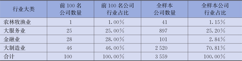 综合大类行业的公司数量和价值创造额分布情况来看,大制造业价值创造额总量最高,但跻身前100名的上市公司数量和价值创造额有待提升,亟须加快产业转型升级,寻求突破,以进一步提升价值创造额水平;金融业价值创造额较高,位居前100名的公司数量较多,对我国经济的价值创造发挥了重要的作用;大服务业可以在保持当前发展优势的基础上,寻找新的价值创造路径,不断优化行业发展;农林牧渔业则要始终保持对环境变化和政策变更的密切关注,积极寻求新的业绩增长点,逐步提升行业价值创造额。