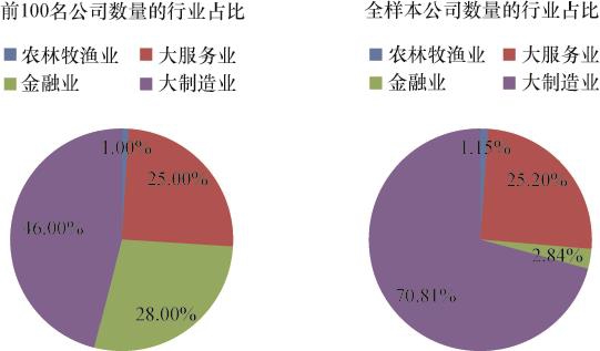 从公司数量的行业分布情况来看,由表2-9和图2-12可知,在全样本价值创造额前100名的上市公司中,大制造业入围46家,数量最多,其中排名最高的是中国石油(601857),名列第二;金融业入围28家,数量仅次于大制造业,其中排名最高的是工商银行(601398),位居榜首,并且前10名中有6家上市公司都来自金融业;大服务业入围25家,其中排名最高的是万科A(000002),位居第10名;农林牧渔业数量最少,仅有温氏股份(300498)一家,其2019年价值创造额排名第88位。进一步结合2019年全样本上市公司数量的行业分布情况可以发现, 2019年,大制造业样本数量最多(2 520家),在全样本中占比70.81%,高于其在价值创造额前100名中的占比(46.00%);表现最为突出的是金融业,金融业样本量虽仅有101 家,在全样本中占比2.84%,但其在价值创造额前100名中占比高达28.00%;大服务业和农林牧渔业在全样本中的占比与在价值创造额前100名中的占比最为吻合。其中,大服务业2019年样本数量为897家,在全样本中占比25. 20%,相应地,其在价值创造额前100名中占比25. 00%;而农林牧渔业2019年样本数量最少(41家),在全样本中占比1. 15%,在价值创造额排名前100名中占比1.00%。