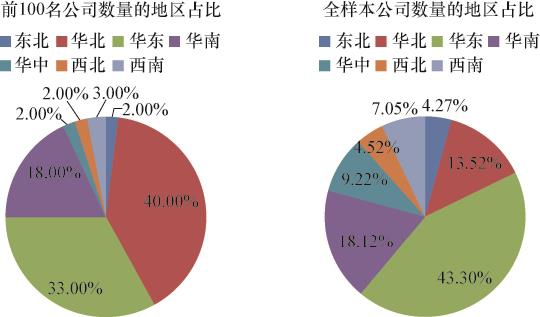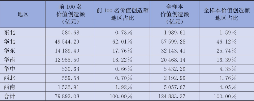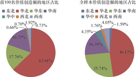 图2-17 2019年价值创造额前100名及全样本上市公司价值创造额的地区分布情况