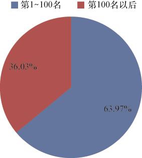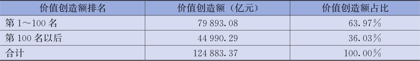 表2-7和图2-10列示了2019年全样本上市公司价值创造额的分布情况,可以发现,全样本上市公司价值创造额共计124 883. 37亿元,其中前100名上市公司实现价值创造额79 893. 08亿元,占全样本价值创造额总量的比例高达63. 97%, 第100名后的上市公司实现价值创造额44 990. 29亿元,占全样本价值创造额的36. 03%,表明我国经济龙头企业贡献了金额庞大的价值创造额。