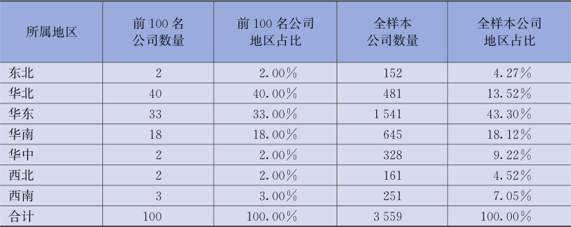 基于所属地区的视角,分别以表格和饼状图的形式列示了2019年全样本价值创造额排名前100位的上市公司数量和价值创造额的地区分布情况,以及全样本上市公司数量和价值创造额的地区分布情况。