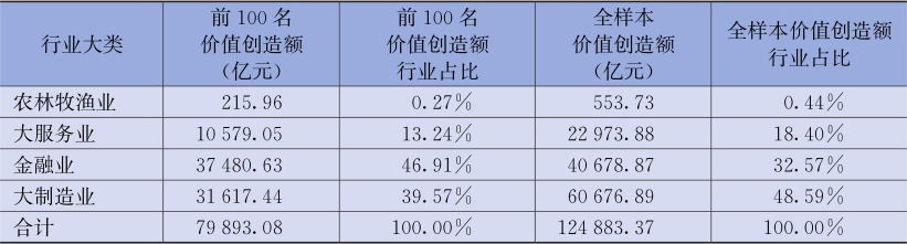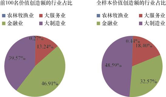 基于大类行业的视角,分别以表格和饼状图的形式列示了2019年价值创造额排名前100位的上市公司数量和价值创造额的行业分布情况,以及全样本上市公司数量和价值创造额的行业分布情况。