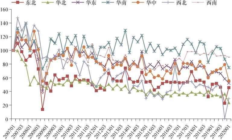 图3-9揭示了各地区的大制造业上市公司的价值创造效率分布情况。由图3-9可知,在样本期间内,华北地区的价值创造效率指数总体呈下滑趋势,且多数时间在七大地区中处于末位。尽管为缓解2008年金融危机的冲击,政府安排了4万亿元投资计划,华北地区作为大型国有企业的注册地,承担了较多的投资份额,但不断下滑的价值创造效率指数说明对华北地区的投资并未达到预期效果。2016年以来,随着国有企业深化改革的不断推进,华北地区的价值创造效率指数出现了稳步回升的势态,但是受中美贸易摩擦持续反复的影响,这一向好趋势被打断,从2018年第4季度开始,再次转入下滑区间。华南地区的价值创造效率指数在2009年之后开始普遍高于国内其他地区,且2017年第2季度实现了较大幅度增长。2018年和2019年,在一系列国内外宏观因素的共同影响下,华南地区的价值创造效率波动幅度有所增大,但整体上仍处于全国领先地位。2016年之前,东北地区的价值创造效率指数呈现震荡调整的趋势,但在2016年第1季度至2017年第3季度之间逐渐企稳;从2017年第4季度开始,再次呈现大幅波动,并在2018年第3季度和2019年第4季度出现大幅下滑。华中和华东地区的价值创造效率指数自2008年以来呈围绕季度均值波动的趋势,整体在2016年第4季度以前呈下降趋势,于2016年第4季度开始回升。华中地区的价值创造效率指数在2019年呈现快速上升态势,这可能与国家提出的建设长江中游城市群和中原城市群等政策相关。西南地区的价值创造效率指数自2016年第3季度以来呈现大幅上升趋势,并于2017年第4季度开始在高位趋于平稳。西北地区的价值创造效率指数在2009年之前受益于大规模的国家政策红利,小幅高于国内其他地区,但在2009年之后开始逐步下跌,到2016年第1—2季度,指数已接近华北地区水平,在2016年第4季度由于受到中油工程(600339)重大资产重组事项的影响,指数出现了剧烈攀升。
