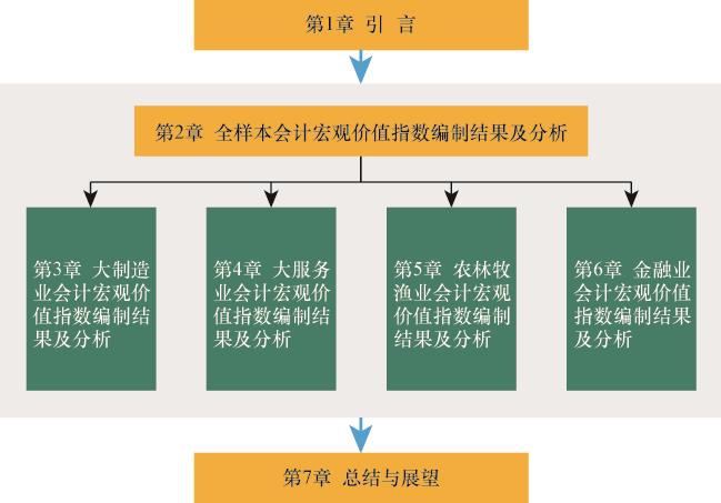 本报告一共包含7章,如图1-2所示。第1章为引言,第2章为全样本会计宏观价值指数编制结果及分析,第3章为大制造业会计宏观价值指数编制结果及分析,第4章为大服务业会计宏观价值指数编制结果及分析,第5章为农林牧渔业会计宏观价值指数编制结果及分析,第6章为金融业会计宏观价值指数编制结果及分析,第7章为总结与展望。本着为读者提供增量信息的原则,本书重点描述最近4个季度(2019年第2季度到2020年第1季度)会计宏观价值指数的趋势。