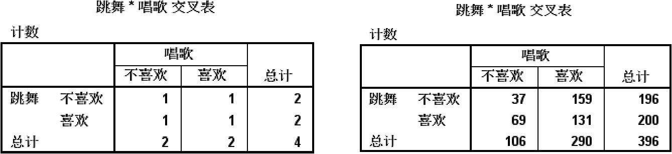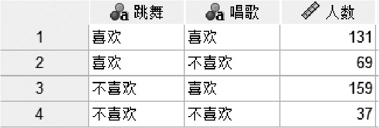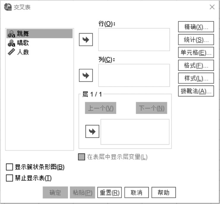 (5)将“跳舞”变量选入“行”,将“唱歌”变量选入列,单击“确定”按钮执行命令。同时,按照同样的方法对未加权的数据集进行操作。