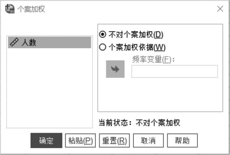 ●不对个案加权:为SPSS默认选项,指对当前数据集不做加权,可用于对做过加权的数据集取消加权。
