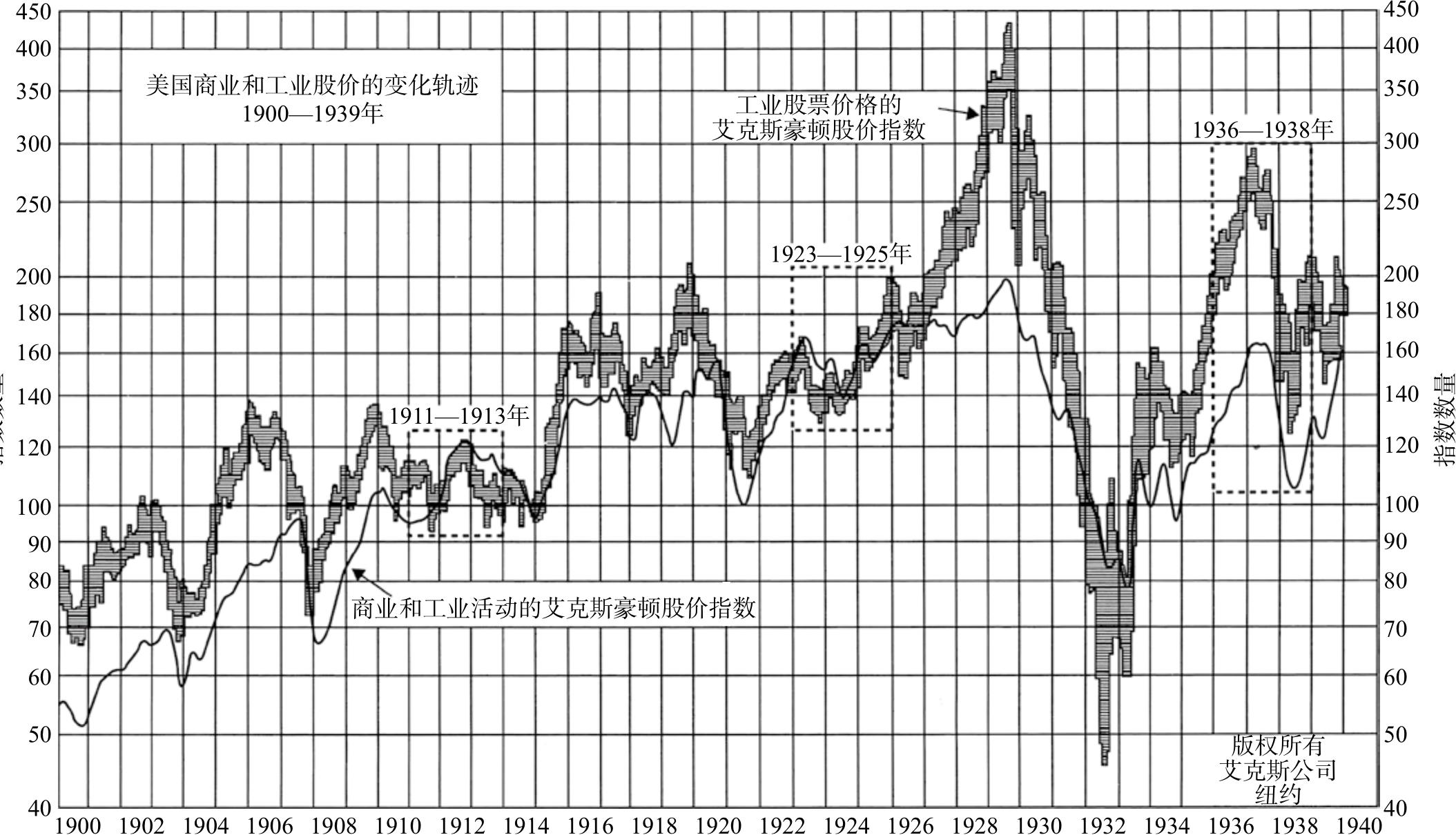 注:a.商业活动和工业股票价格的艾克斯豪顿(Axe-Houghton)股价指数都未经趋势调整;10只高等级铁路债券的收益率——由艾克斯公司(E. W. Axe & Co., Inc.)提供。