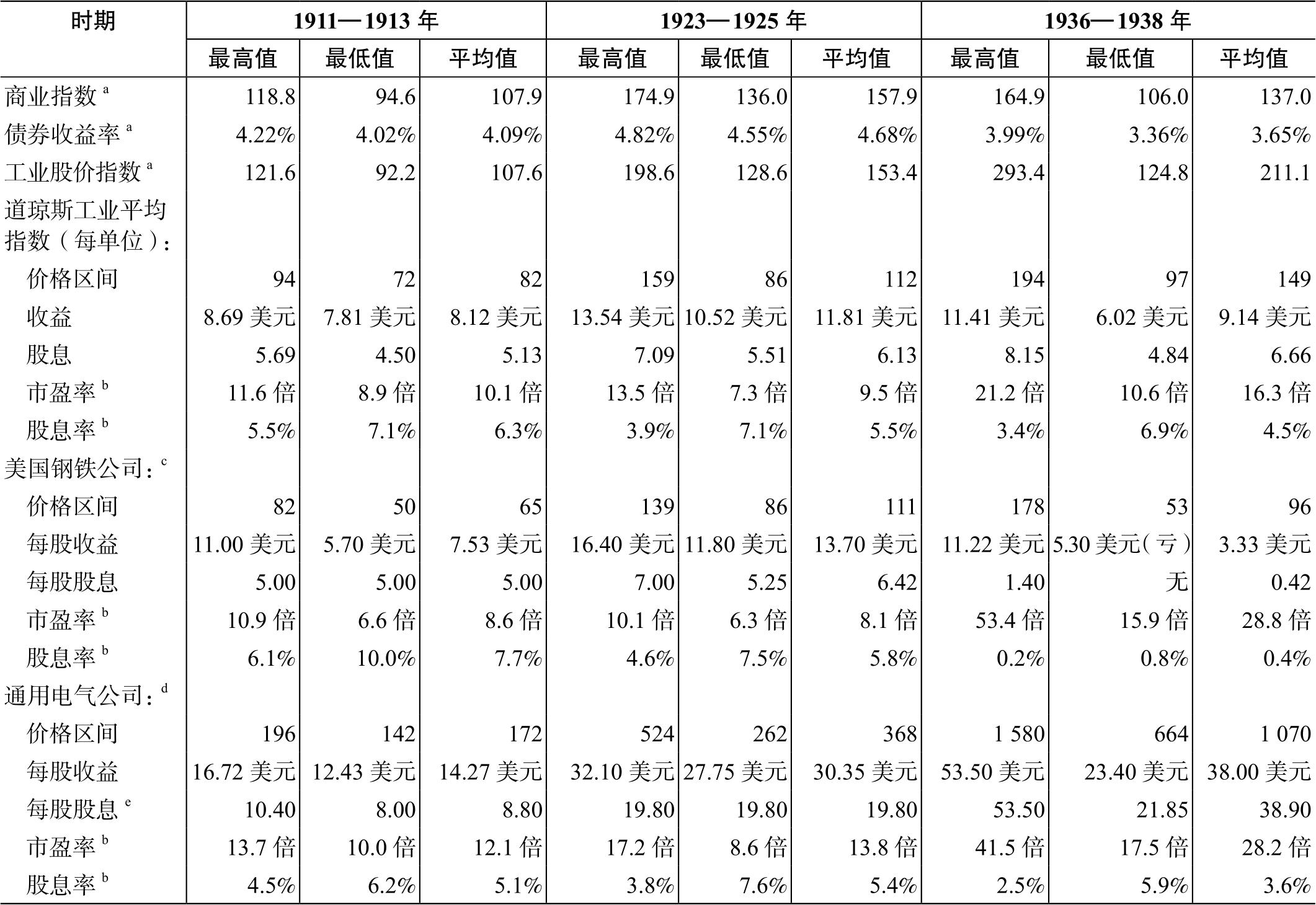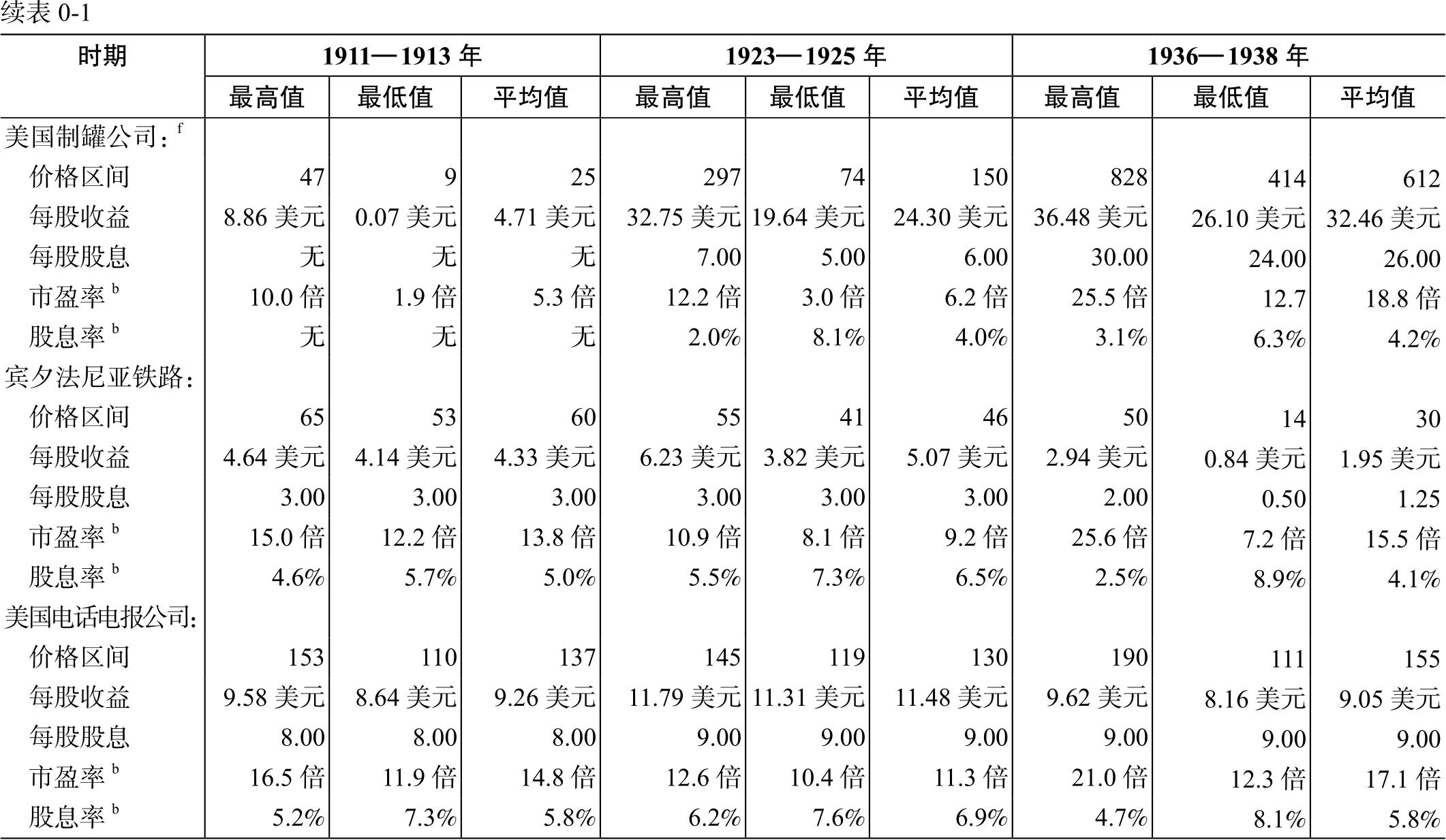 公司利润的未来走势。 如果我们借鉴过去的经验来研究这些问题,最可能的反应是对就股票市场未来所有相关问题所作的判断,保持合理的质疑态度。表0-1中的数据很清楚地表明,1926年以前,市场在总体上低估了工业普通股的吸引力。它们的价格通常反映了对过去和现在收入的谨慎评估,但没有证据表明,该价格反映了作为快速扩张领域内的领先企业,其具备的增长可能性所带来的溢价。1913年,铁路和拖拉机占据了债券和股票投资的绝大部分,到了1925年,大部分的城市有轨电车投资遭遇了汽车行业发展的威胁。但即便如此,蒸汽铁路并没有遭受类似威胁的迹象。