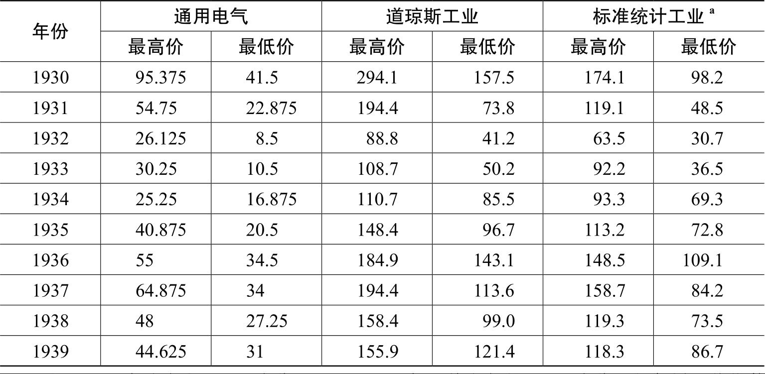 表0-2 1930—1939年通用电气普通股、道琼斯工业股票指数、标准统计工业股票指数的价格变动幅度 (单位:美元)