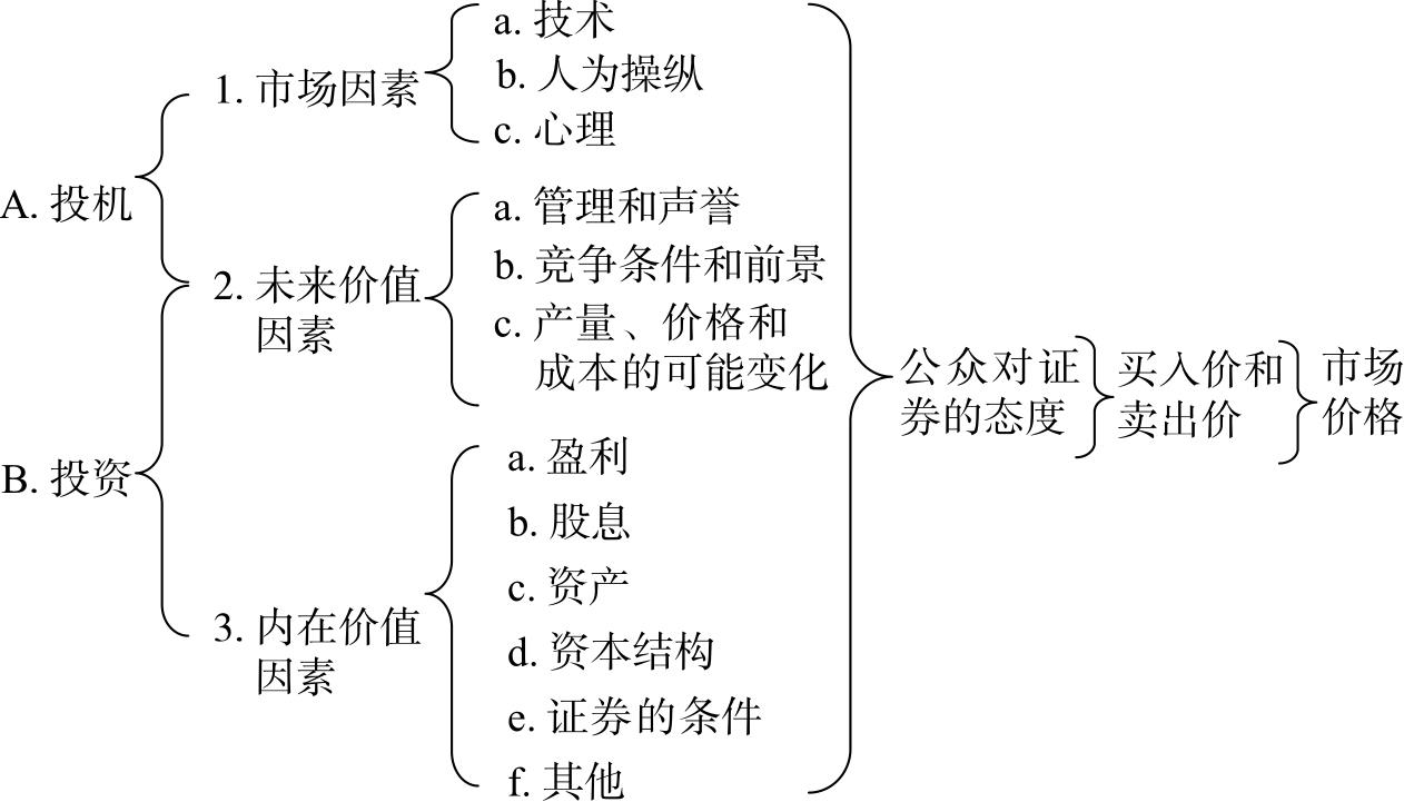 通过图1-1可以清楚看到证券内在价值与市场价格的关系,该图追踪了市场价格的影响因素和形成步骤。从图中可以明显地看出,我们所说的分析因素对市场价格的影响是局部的、间接的——所谓局部,是因为纯粹的投机性因素经常从相反的方向影响价格;所谓间接,是因为它要通过人们的投资情绪和决定才能影响证券的市场价格。换句话说,市场不是一个天平,不能根据每只证券的特性来精确、客观地记录它们的价值。相反,我们应该称市场为一个投票机,由无数的个人参与选择,这些选择部分出于理性,部分出于感性。