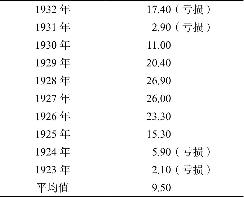 为了使这个推理更清楚,我们来看一个典型的例子。我们对1933年凯斯公司(J. I. Case Company)普通股的内在价值的分析将会有怎样的结果呢?该股票的市场价格是30美元,每股净资产为176美元,未支付股息;十年平均收益达到每股9.50美元,1932年的业绩是每股亏损17美元。如果遵循通常的估价方法,我们可能会用普通股十年内的每股平均盈利乘以10,得到95美元的内在价值。但是,让我们看看组成这10年平均值的具体数字(如表1-1所示)。很显然,平均值9.50美元只是从10个无关的数字得出的算术结果,很难让人相信这个结果反映了这家公司过去的典型情况,或预测了其未来的趋势。因此,任何从这个平均值得出的“真实价值”或“内在价值”都是随机的或是虚假的。
