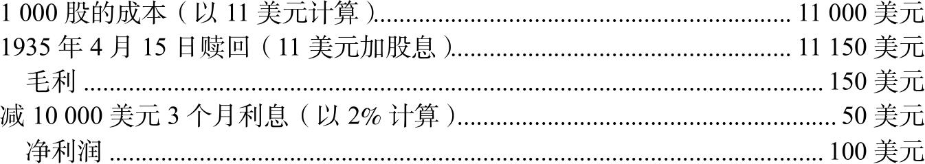 例2:这个证券被赎回后,价格迅速下降到每股11美元。当时,该证券提供了以保证金进行短期投资的难得机会,收益颇丰。1935年1月15日,在每股11美元(未支付佣金)的价格下购买股份的经纪人,可以凭每股以每年不超过2%的利息立刻借入10美元。此操作给他的投资带来了每年回报率40%