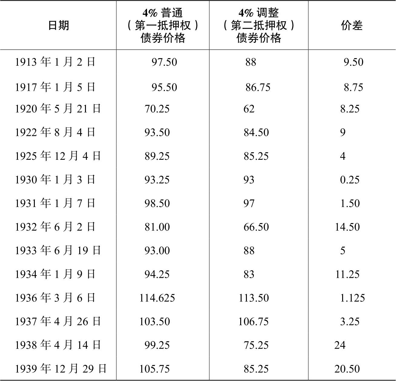 1924年以前,艾奇逊公司发行的票面利率为4%的普通债券售价,通常比票面利率为4%的调整债券高出7%~10%,收益率大约低0.5%。因为这两种债券的安全性都没有问题,因此,以低10%的成本买入次级债券显得更加合理。1923年以后,这个观点得到证实,两种债券的价格差异逐渐缩小。1930年全年和1931年的部分时间里,调整债券的价格经常与普通债券基本相同。与1922—1923年的过大价差相比,这种关系显得更不合理,原因在于票面利率为4%的调整债券的价格和收益率的优势太小,即使两种抵押权的安全性都不存问题,也不值得投资者为了这么小的价格优势而接受较低的抵押权地位。