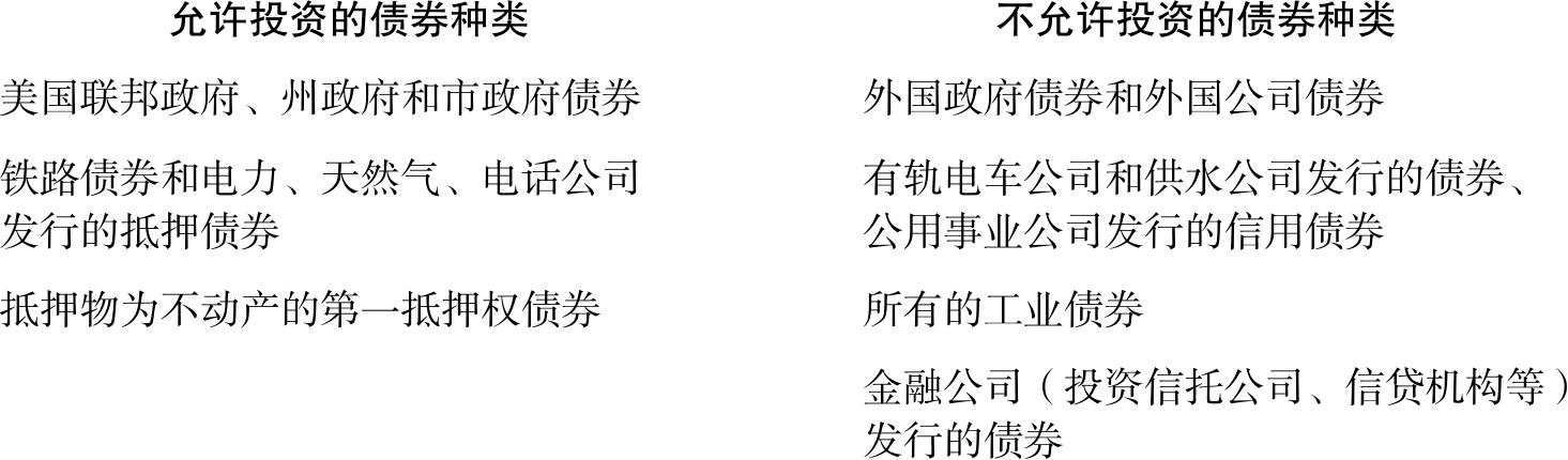 如前文所述,高等级债券的选择是一个排除过程,它在制定剔除不适合债券的规则和标准的实际应用中相当有效。实际上,美国许多州都通过立法制定了类似规则,用以监管储蓄银行和信托基金的投资行为。其中,大部分州的银行监管部门每年会根据这些规则准备一个证券列表,表内的证券被认为是“合法的”,即满足条件,相关机构可以依法购买。