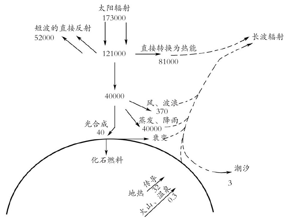 从图上可以看出,地球上的风能、水能、海洋温差能、波浪能和生物质能以及部分潮汐能都是来源于太阳;即使是地球上的化石燃料(如煤、石油、天然气等),从根本上说也是远古以来储存下来的太阳能,所以广义的太阳能所包括的范围非常大,狭义的太阳能则限于太阳辐射能的光热、光电和光化学的直接转换。