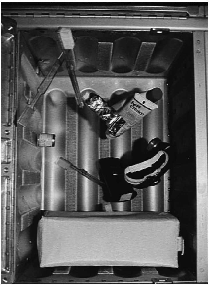 图1.8 太空微重力环境下处于悬浮状态的牙刷、牙膏、剃须刀等卫生用品