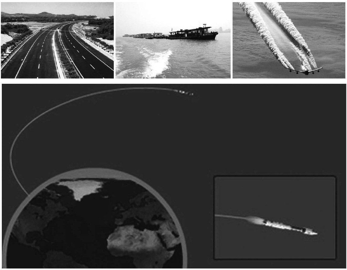 图1.5 高速公路、轮船航道、飞机航线和航天器运行轨道