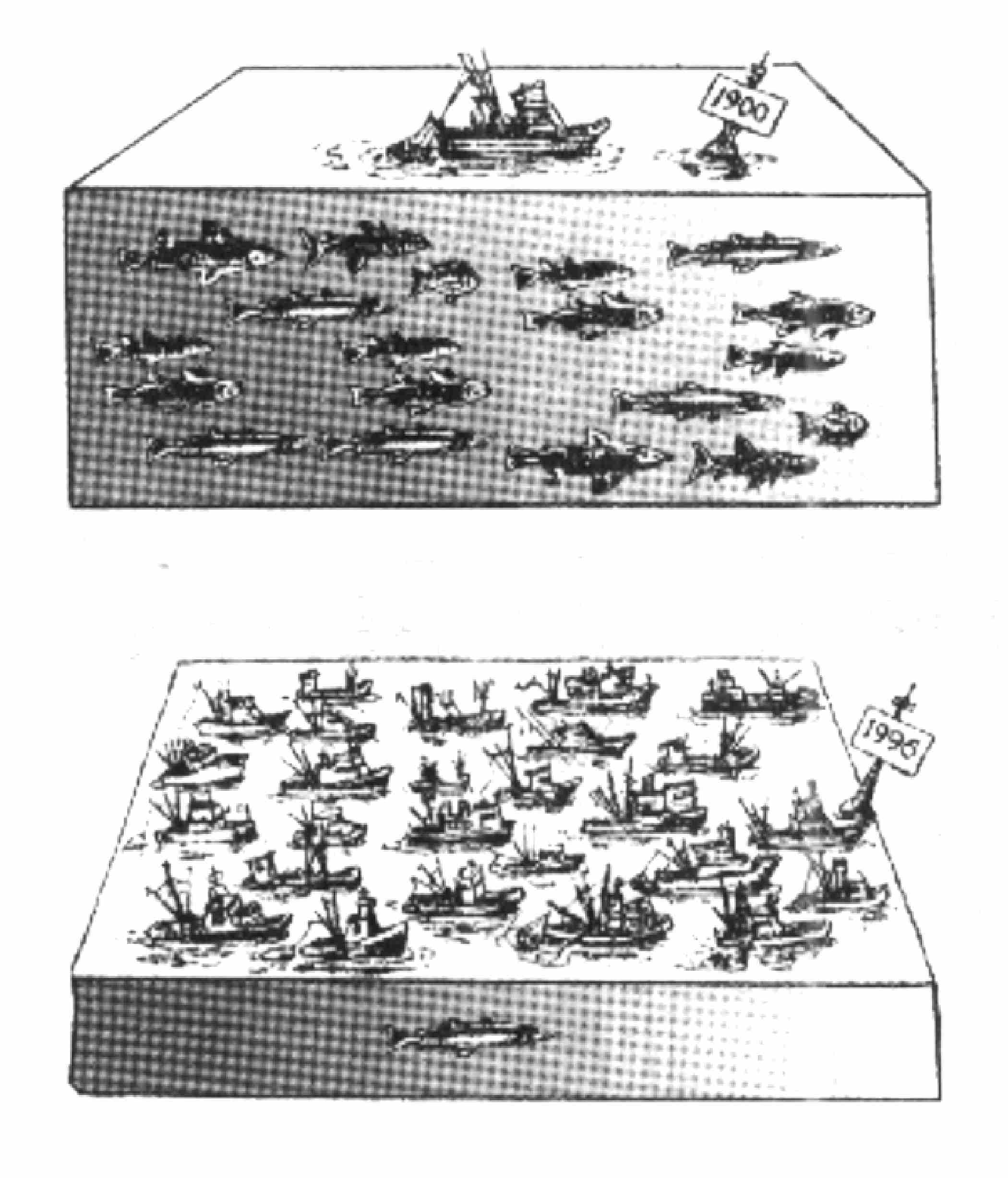 The two pictures show a sharp change in the world commercial fishing. They display totally different scenes. There were a lot of fish with one fishing boat in the sea in 1900 while the situation was just the opposite in 1995. We can see that within about 100 years, humans have stripped the sea of her generous offerings, and the fish supplies have almost been exhausted by overfishing.