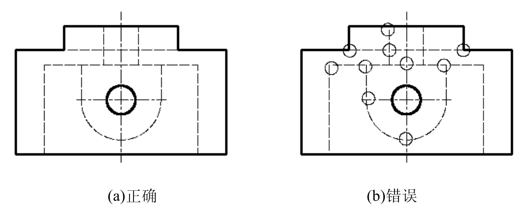 点画线、虚线与粗实线相交以及点画线、虚线彼此相交时,均应交于点画线或虚线的线段处。虚线与粗实线相连时,应留间隙;虚直线与虚半圆弧相切时,在虚直线处留间隙,而虚半圆弧画到对称中心线为止。
