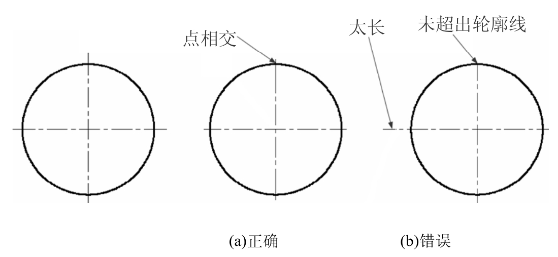 (3)绘制圆的对称中心线时,圆心应为直线的交点。点画线和双点画线的首末两端应是线段而不是短画。建议中心线超出轮廓线2~5mm,如图1-7所示。