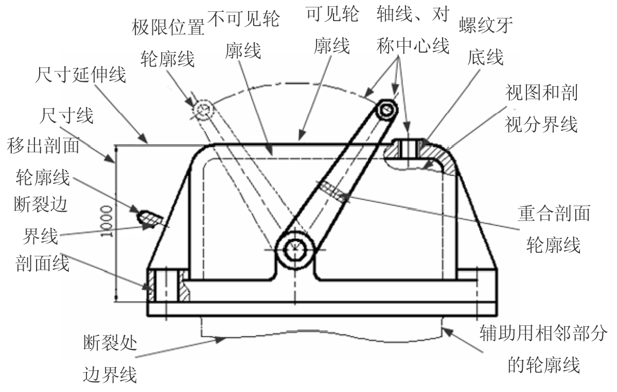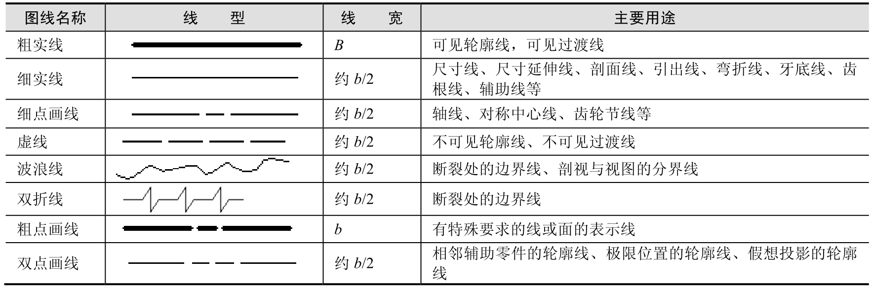 国标规定了各种图线的名称、型式、宽度以及在图上的一般应用,见表1-4及图1-6所示。图线分粗、细两种,粗线的宽度 b 应按图的大小和复杂程度,在0.5~2mm之间选择。