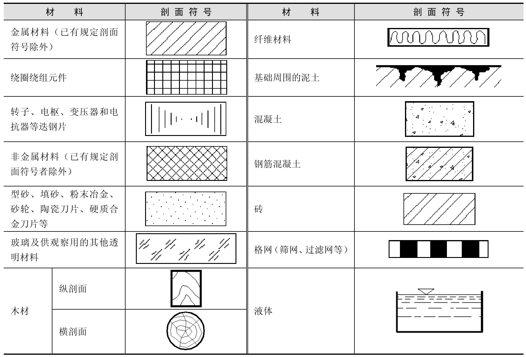 在剖视和剖面图中,应采用表1-5所规定的剖面符号(GB4457.5-1984)。