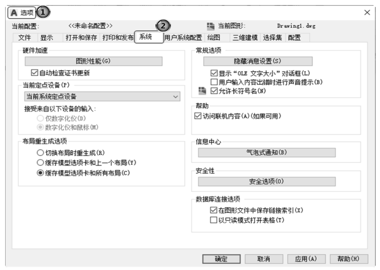 第5个选项卡为“系统”选项卡,如图2-20所示。该选项卡用来设置AutoCAD系统的有关特性。其中“常规选项”选项组确定是否选择系统配置的有关基本选项。