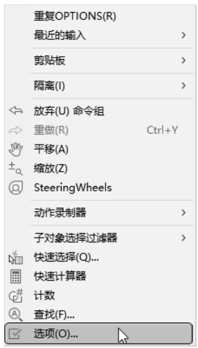 快捷菜单:在绘图区右击,系统打开快捷菜单,如图2-19所示,选择“选项”命令。