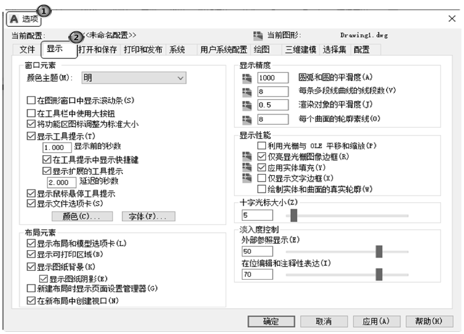 第2个选项卡为“显示”选项卡,该选项卡用于控制AutoCAD系统的外观,如图2-21所示。该选项卡设定滚动条显示与否、界面菜单显示与否、绘图区颜色、光标大小、AutoCAD的版面布局设置、各实体的显示精度等。