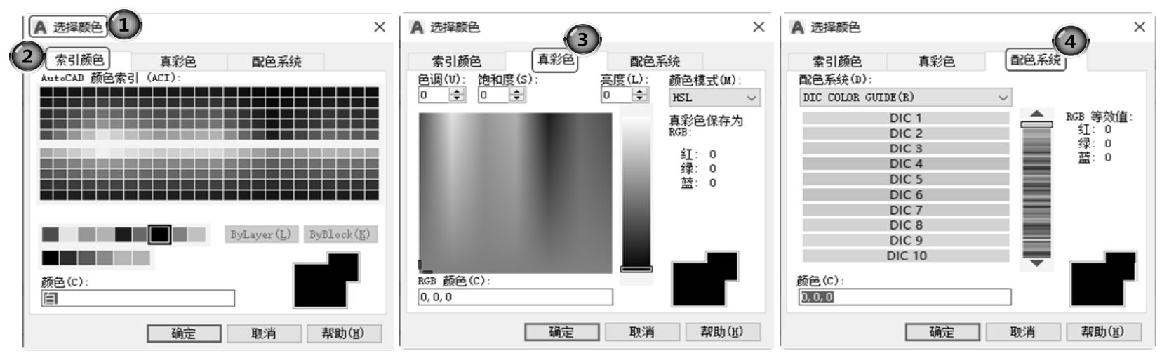 配色系统3个选项卡来选择颜色。系统显示RGB配比,即Red(红)、Green(绿)和Blue(蓝)3种颜色。