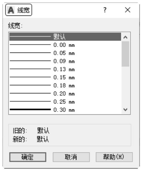 图层线宽的默认值为0.25mm。在状态栏为“模型”状态时,显示的线宽同计算机的像素有关。线宽为零时,显示为一个像素的线宽。单击状态栏中的“线宽”按钮,屏幕上显示的图形线宽,显示的线宽与实际线宽成比例,但线宽不随着图形的放大和缩小而变化。“线宽”功能关闭时,不显示图形的线宽,图形的线宽均为默认宽度值显示。可以在“线宽”对话框选择需要的线宽。