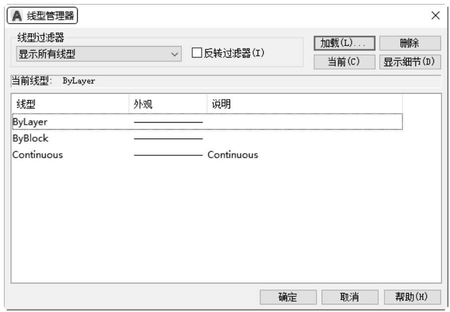 默认情况下,在“已加载的线型”列表框中,系统中只添加了Continuous线型。