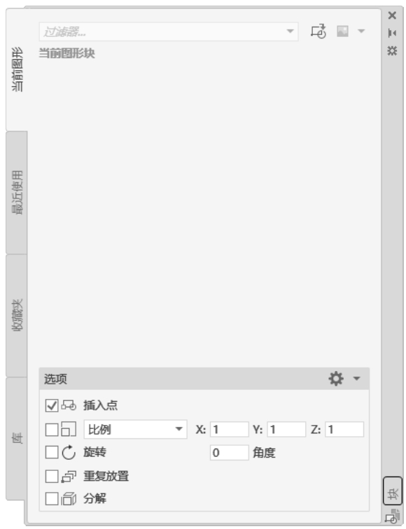 执行上述命令后,系统打开“块”选项板,如图2-50所示,可以指定要插入的图块及插入位置。