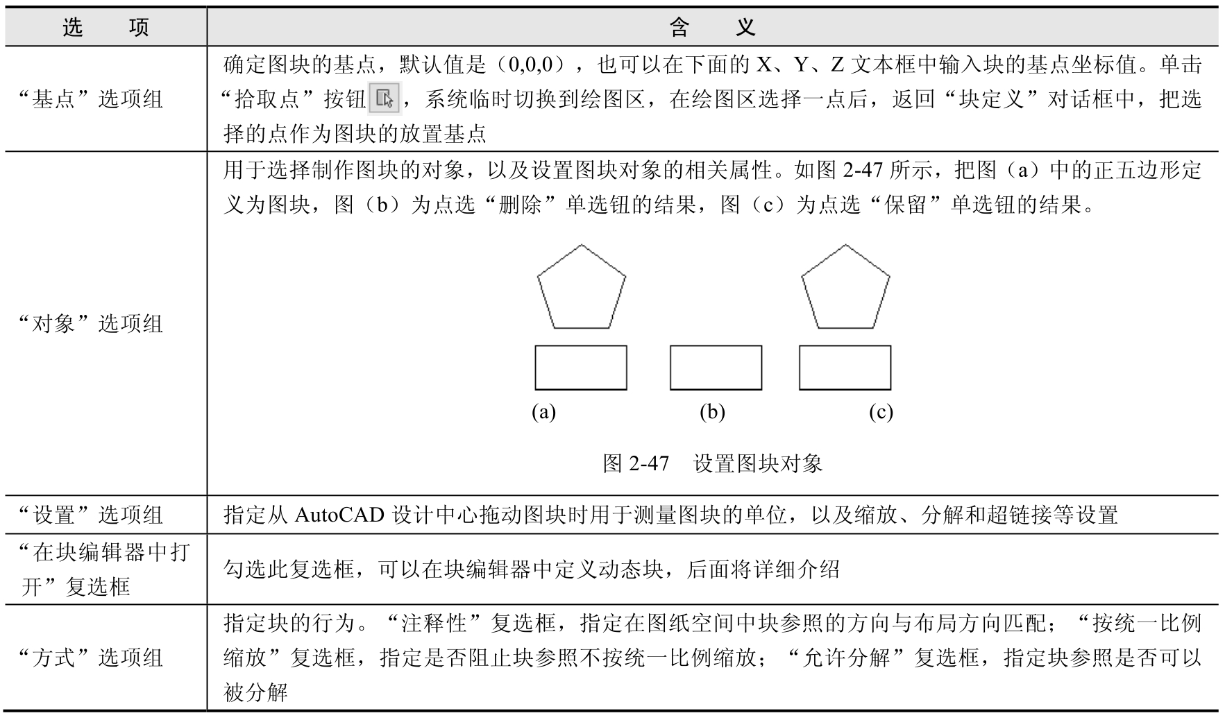 执行上述命令后,系统打开如图2-46所示的“块定义”对话框,利用该对话框可定义图块并为之命名。