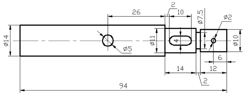 重复“直线”命令,绘制坐标点为(110,135)和(110,125)的Ф5圆的竖直中心线,坐标点为(158,133)和(158,127)的Ф2圆的竖直中心线。