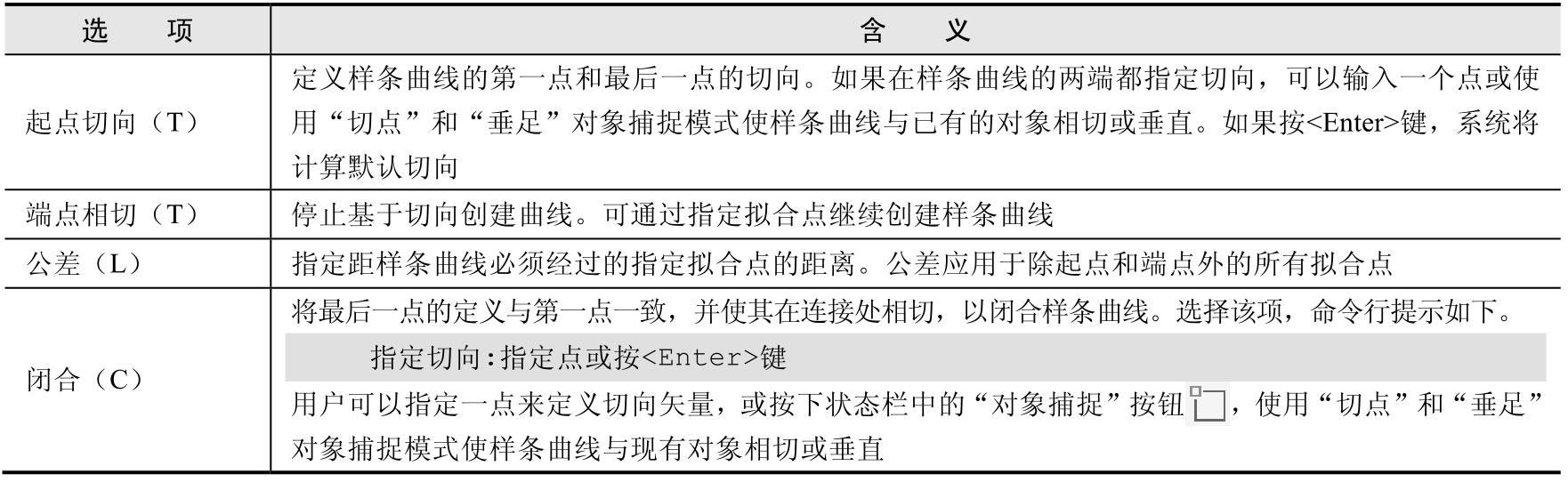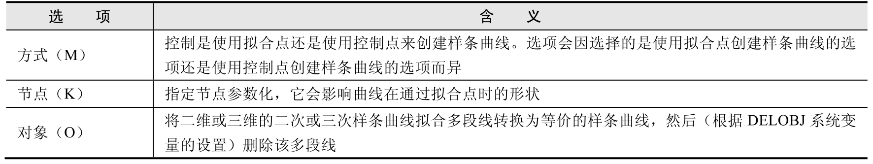 表3-7 “样条曲线”命令选项含义