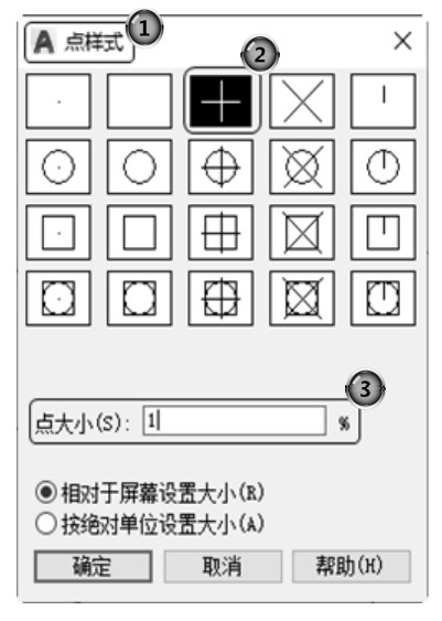 (5)在命令行中输入“DDPTYPE”命令,或者选择“默认”选项卡“实用工具”面板中的“点样式”按钮,打开“点样式”对话框,如图3-79所示。将点样式设为