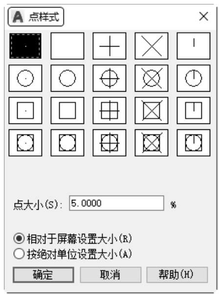 (3)点在图形中的表示样式,共有20种。可通过“DDPTYPE”命令或选择菜单栏中的“格式”→“点样式”命令,通过打开的“点样式”对话框来设置,如图3-75所示。
