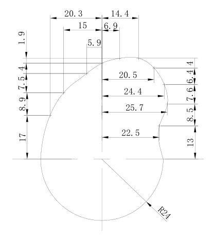 (6)将“粗实线”图层设置为当前图层,绘制凸轮下半部分圆弧,圆心坐标为(0,0),圆弧起点坐标为(24,0),包含角度为-180,绘制效果如图3-82所示。