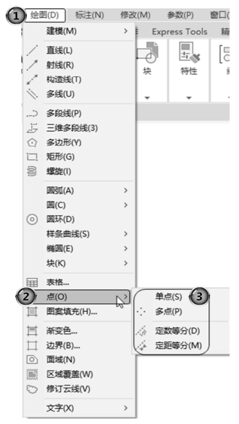 (1)通过菜单方法操作时(如图3-74所示),“单点”命令表示只输入一个点,“多点”命令表示可输入多个点。