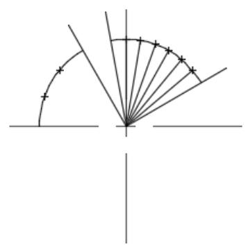 用同样的方法将另一条圆弧7等分,绘制结果如图3-80所示。将中心点与第二段弧线的等分点连上直线,如图3-81所示。
