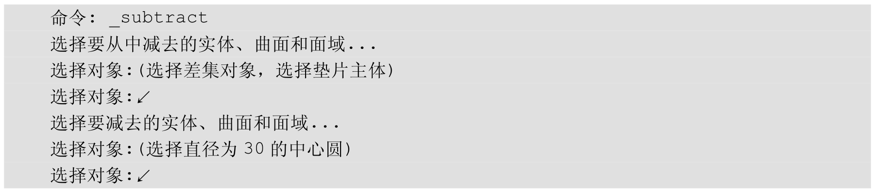 ,以并集对象为主体对象,直径为30的中心圆为对象进行差集处理,命令行提示与操作如下。