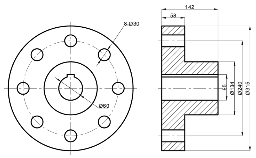 本实例绘制如图3-100所示的联轴器。联轴器是用来连接不同机构中的两根轴使之共同旋转以传递扭矩的机械零件。本实例主要通过直线命令、圆命令和图案填充命令来绘制。