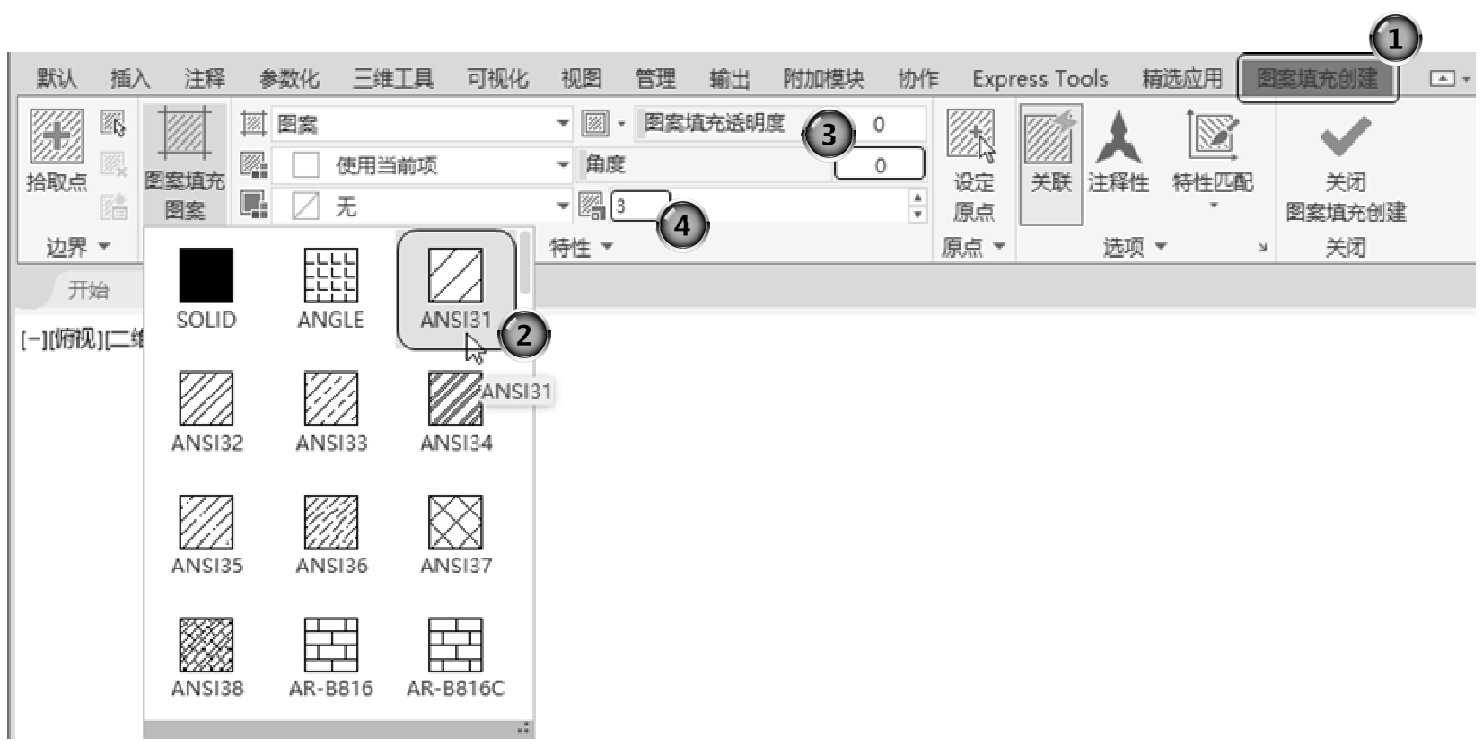 执行上述命令后,系统打开如图3-94所示的“图案填充创建”选项卡,其面板和按钮含义介绍如下。