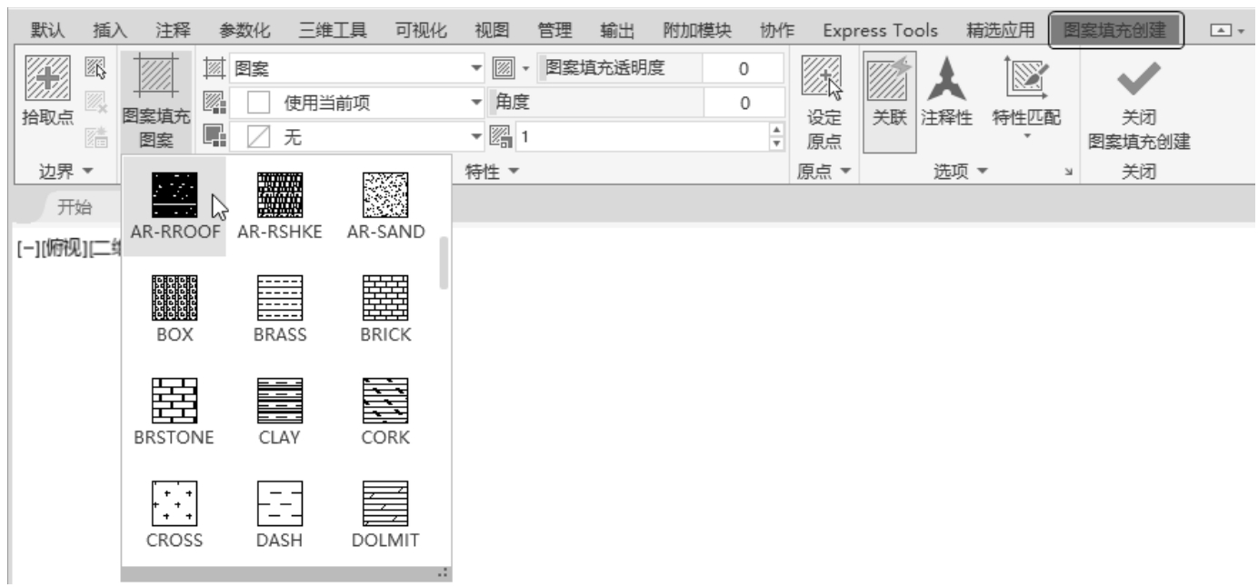 功能区:单击“默认”选项卡“绘图”面板中的“图案填充”按钮