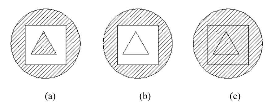 (1)普通方式。如图3-93(a)所示,该方式从边界开始,从每条填充线或每个填充符号的两端向里填充,遇到内部对象与之相交时,填充线或符号断开,直到遇到下一次相交时再继续填充。采用这种填充方式时,要避免剖面线或符号与内部对象的相交次数为奇数,该方式为系统内部的缺省方式。